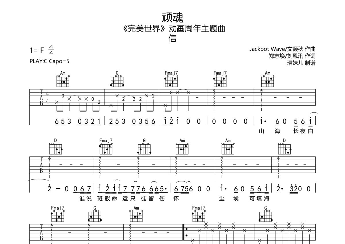 《顽魂》是信演唱的一首歌曲,本吉他谱采用的是C调指法编配,这份吉他谱共有三张高清图谱,图谱由 @珺妹儿 编配上传,图谱使用六线谱编配,包含吉他和弦指法、简谱以及歌词部分,使用这份顽魂吉他谱,可以让你更加方便地掌握这首歌曲的弹唱技巧,快来尝试吧。完美世界》动画周年主题曲,本谱采用C调指法编配,弹唱建议变调夹5品,速度85BPM,难度较简单,易上手。