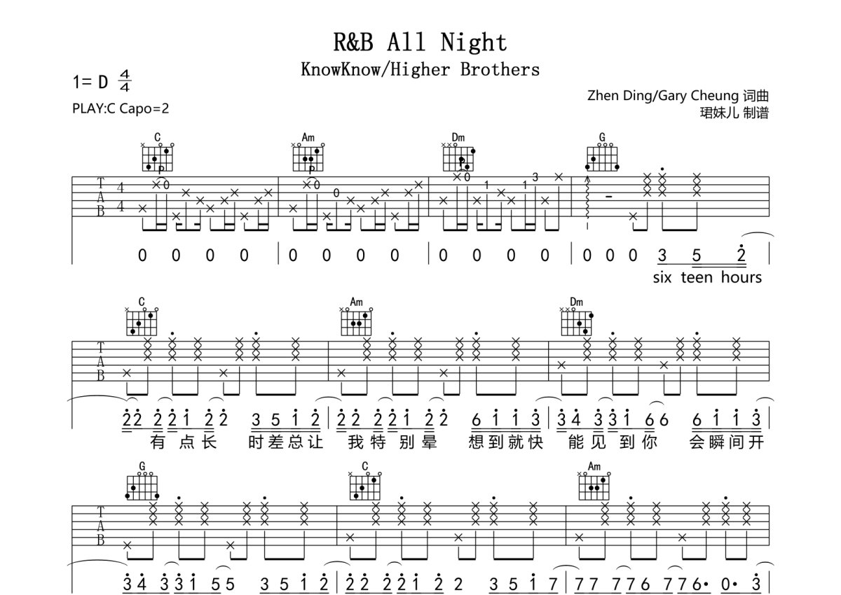 KnowKnow/Higher Brothers《R&B All Night》吉他谱 - C调弹唱六线谱