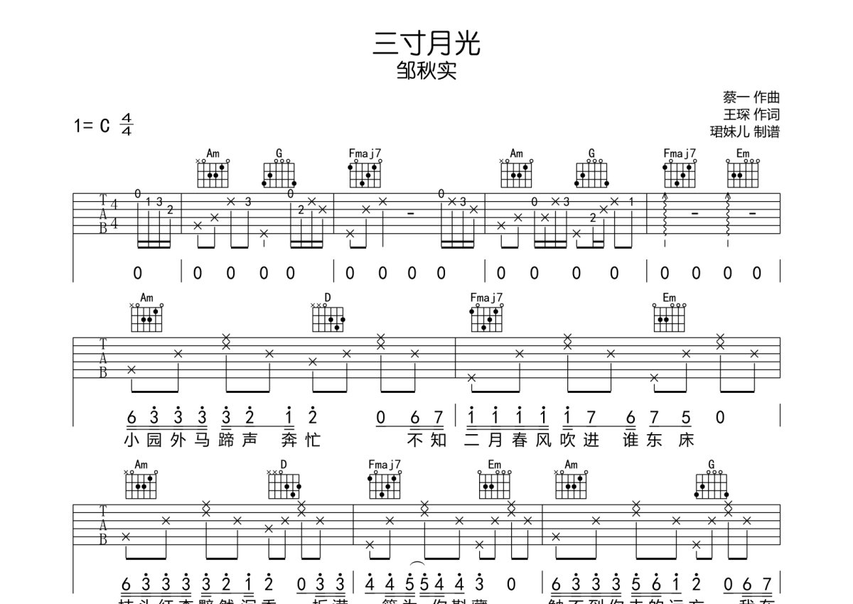 邹秋实《三寸月光》吉他谱 - C调弹唱六线谱