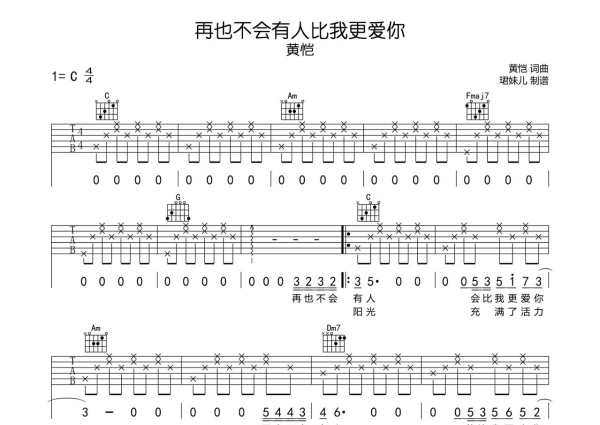 黄恺《再也不会有人会比我更爱你》吉他谱 - C调弹唱六线谱