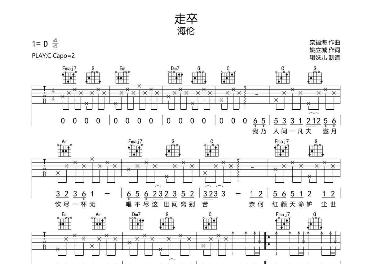 《走卒》是海伦演唱的一首歌曲,本吉他谱采用的是C调指法编配,这份吉他谱共有两张高清图谱,图谱由 @珺妹儿 编配上传,图谱使用六线谱编配,包含吉他和弦指法、简谱以及歌词部分,使用这份走卒吉他谱,可以让你更加方便地掌握这首歌曲的弹唱技巧,快来尝试吧。4/4拍的节奏,难度为低级。歌曲原调为D调,这里曲谱采用C调指法进行编配,演唱时夹变调夹2品可回到原调,也可根据个人嗓音情况选择,演奏速度建议保持75bmp,也可自由发挥。