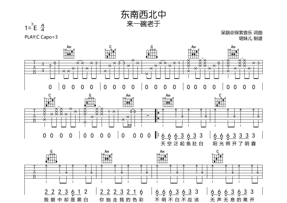 《东南西北中》是来一碗老于演唱的一首歌曲,本吉他谱采用的是C调指法编配,这份吉他谱共有三张高清图谱,图谱由 @珺妹儿 编配上传,图谱使用六线谱编配,包含吉他和弦指法、简谱以及歌词部分,使用这份东南西北中吉他谱,可以让你更加方便地掌握这首歌曲的弹唱技巧,快来尝试吧。本谱采用C调指法编配,弹唱建议变调夹3品,速度110BPM,难度较简单,易上手。