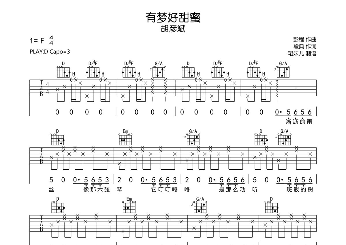 胡彦斌《有梦好甜蜜》吉他谱 - D调弹唱六线谱