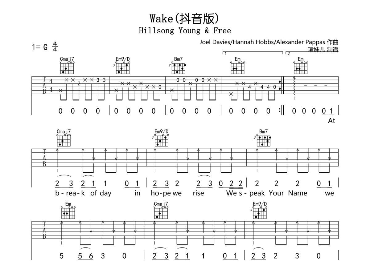 《Wake》是Hillsong Young & Free演唱的一首歌曲,本吉他谱采用的是G调指法编配,这份吉他谱共有四张高清图谱,图谱由 @珺妹儿 编配上传,图谱使用六线谱编配,包含吉他和弦指法、简谱以及歌词部分,使用这份Wake吉他谱,可以让你更加方便地掌握这首歌曲的弹唱技巧,快来尝试吧。本谱采用G调指法编配,速度120BPM,难度较简单,易上手。