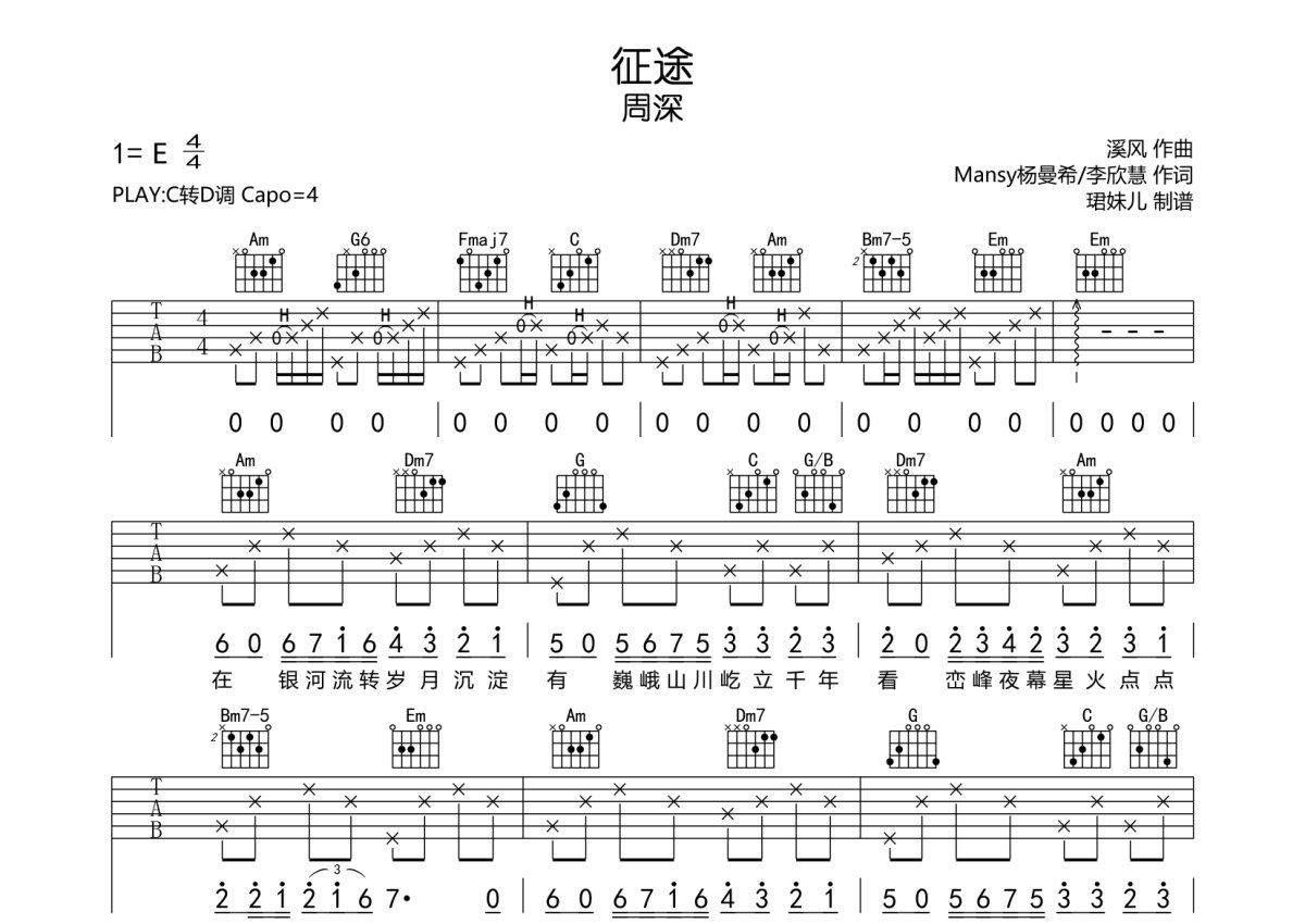 周深《征途》吉他谱 - C调弹唱六线谱