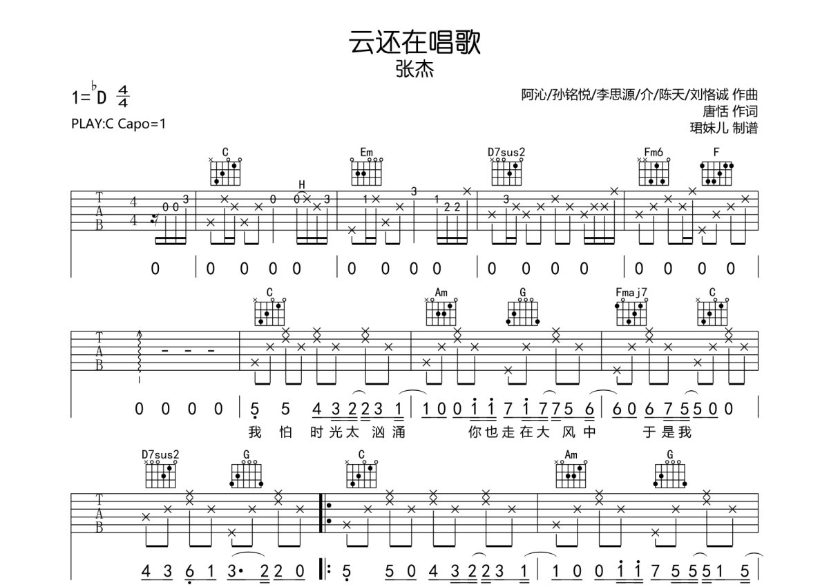 《云还在唱歌》是张杰演唱的一首歌曲,本吉他谱采用的是C调指法编配,这份吉他谱共有三张高清图谱,图谱由 @珺妹儿 编配上传,图谱使用六线谱编配,包含吉他和弦指法、简谱以及歌词部分,使用这份云还在唱歌吉他谱,可以让你更加方便地掌握这首歌曲的弹唱技巧,快来尝试吧。本谱采用C调指法编配,弹唱建议变调夹1品,速度85BPM,难度较简单,易上手。