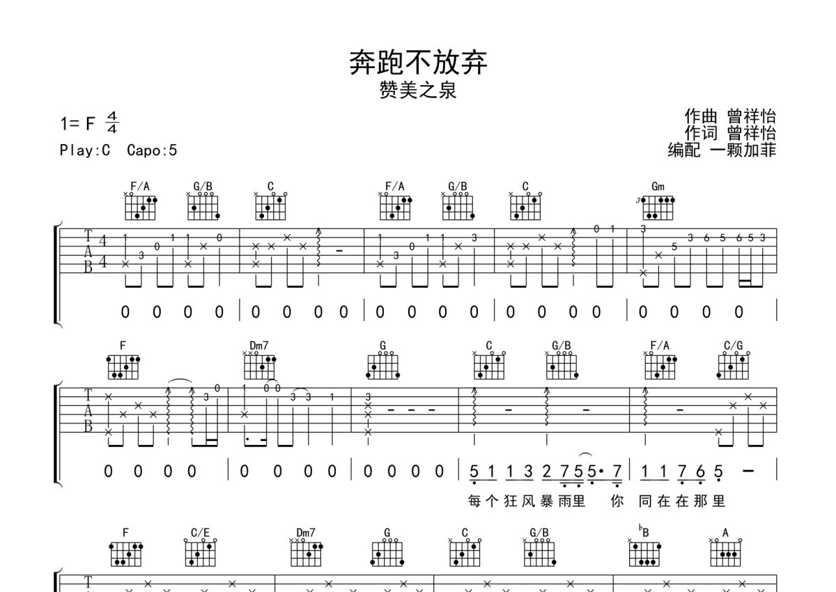 《奔跑不放弃》是赞美之泉演唱的一首歌曲,完整编配版,本吉他谱采用的是C调指法编配,这份吉他谱共有五张高清图谱,图谱由 @一颗加菲 编配上传,图谱使用六线谱编配,包含吉他和弦指法、简谱以及歌词部分,曲谱配备了相关的音频提供试听,使用这份奔跑不放弃吉他谱,可以让你更加方便地掌握这首歌曲的弹唱技巧,快来尝试吧。