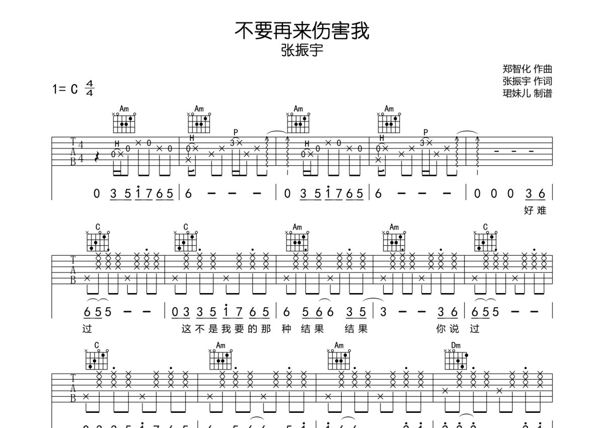张振宇《不要再来伤害我》吉他谱 - C调弹唱六线谱