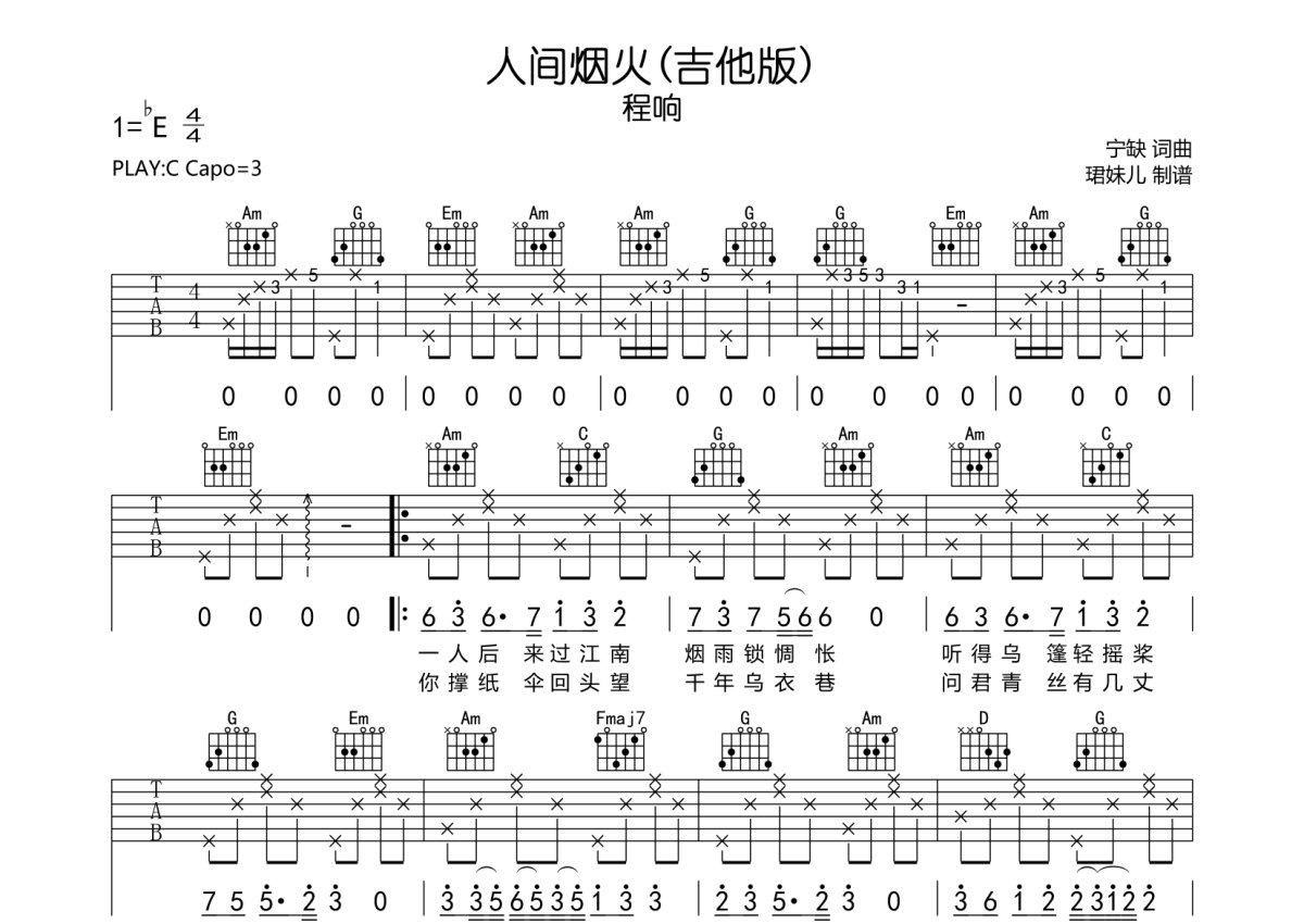 程响《人间烟火》吉他谱 - C调弹唱六线谱