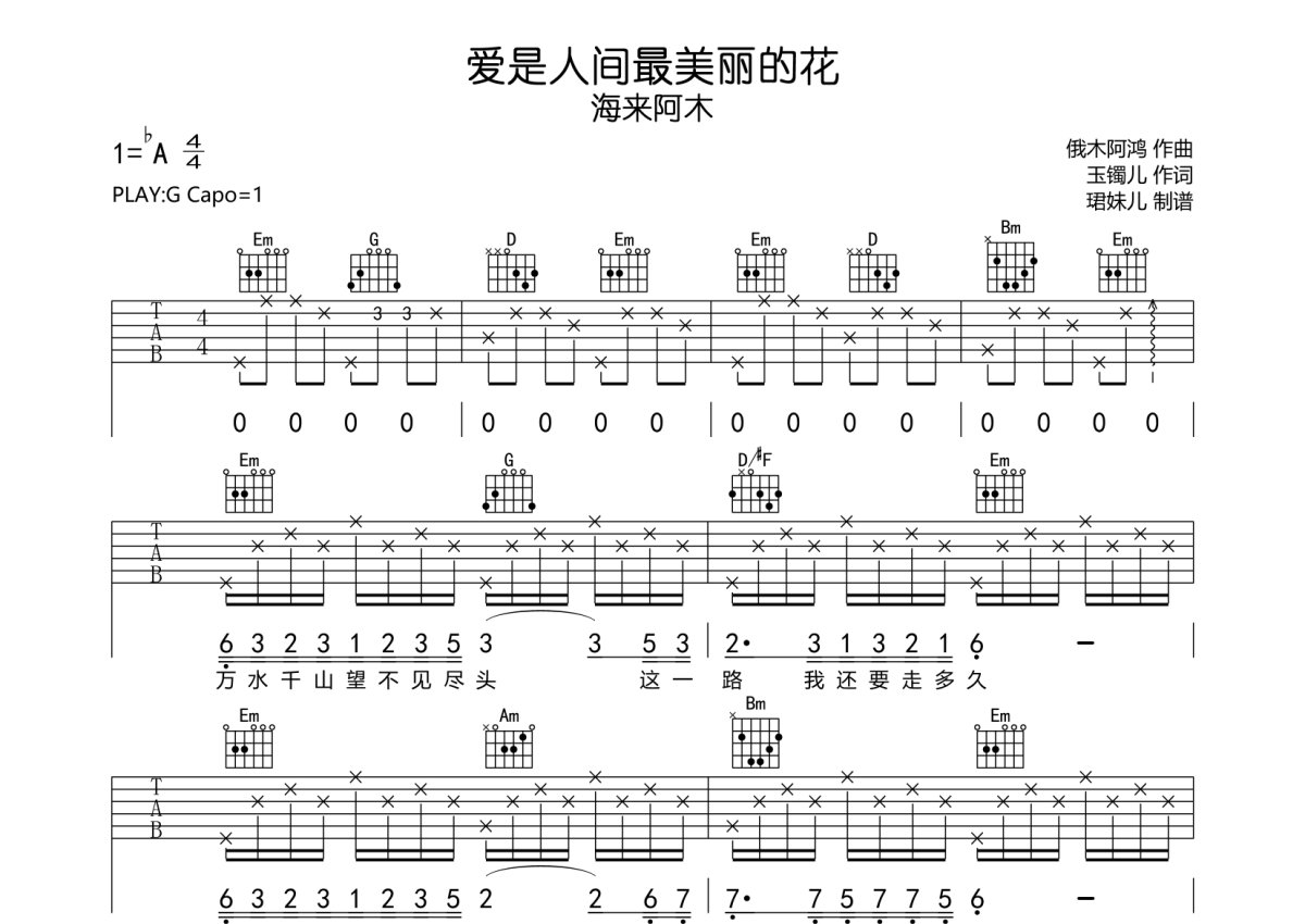 海来阿木《爱是人间最美丽的花》吉他谱 - G调弹唱六线谱