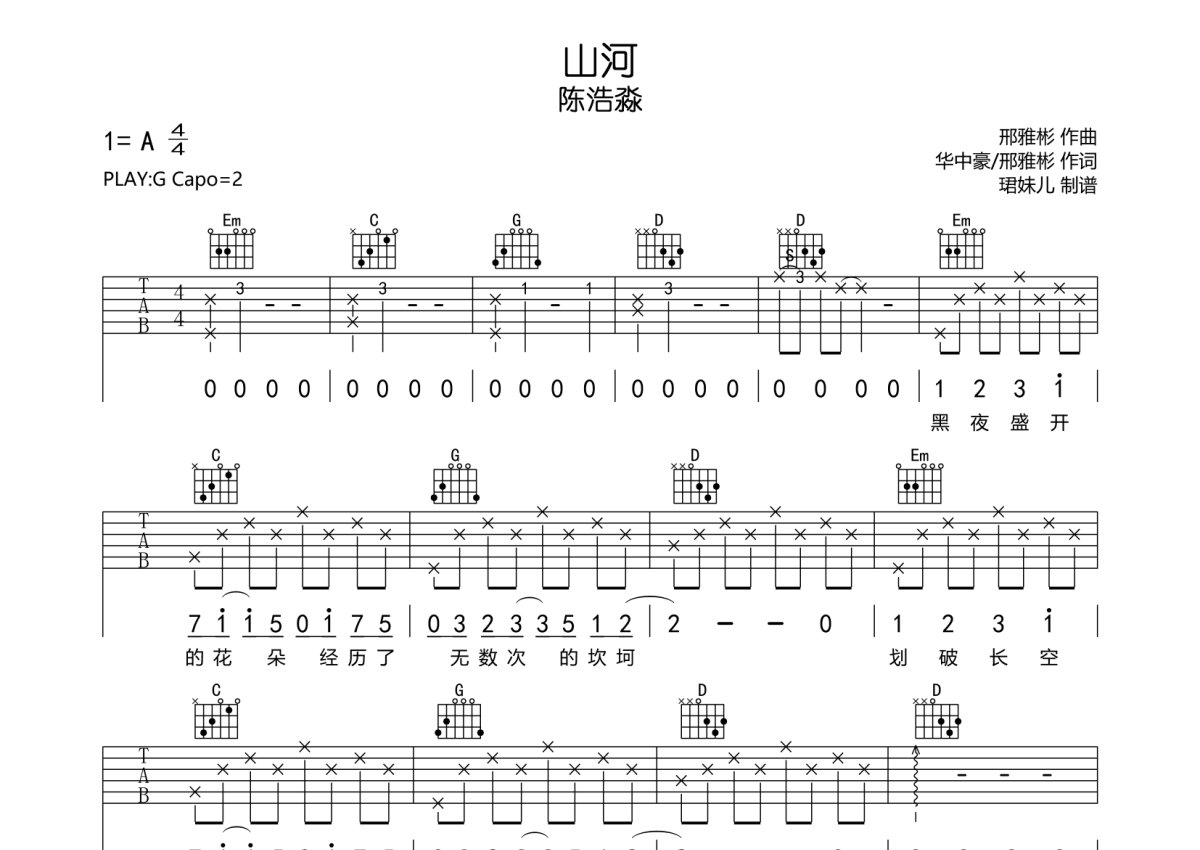陈浩淼《山河》吉他谱 - G调弹唱六线谱