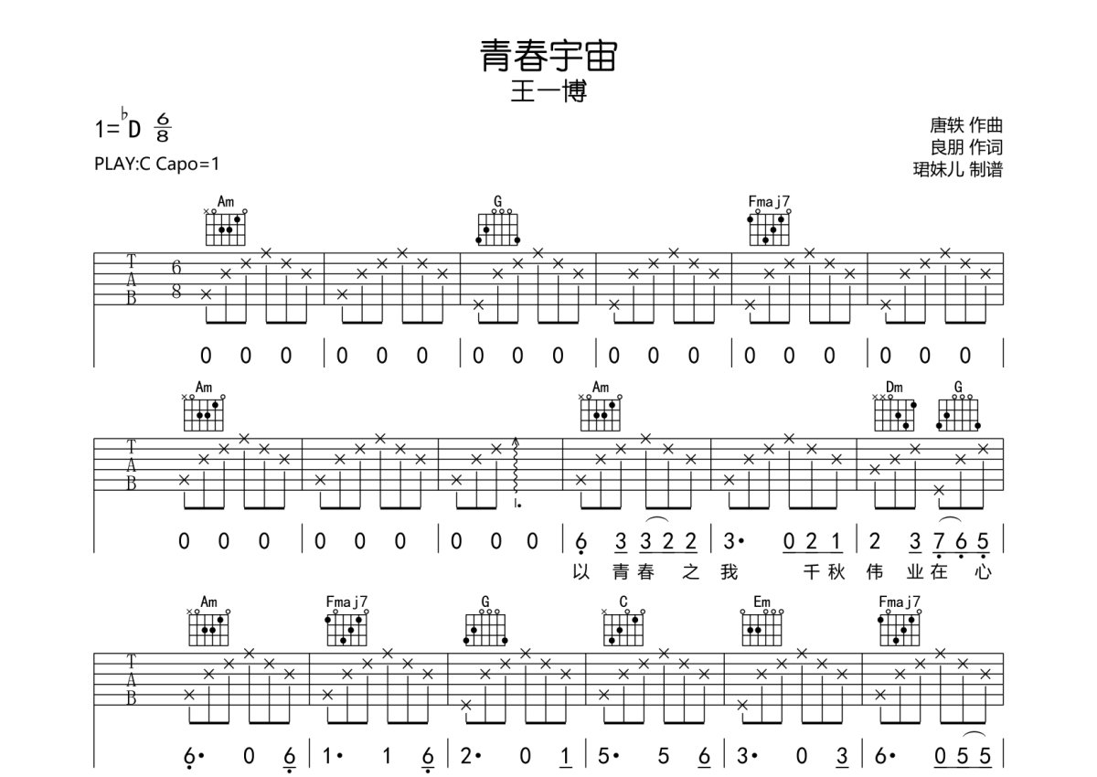 王一博《青春宇宙》吉他谱 - C调弹唱六线谱