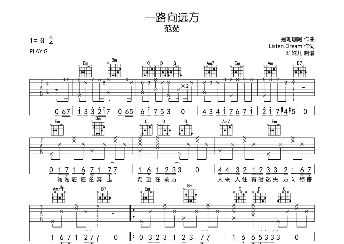 范茹《一路向远方》吉他谱 - G调弹唱六线谱