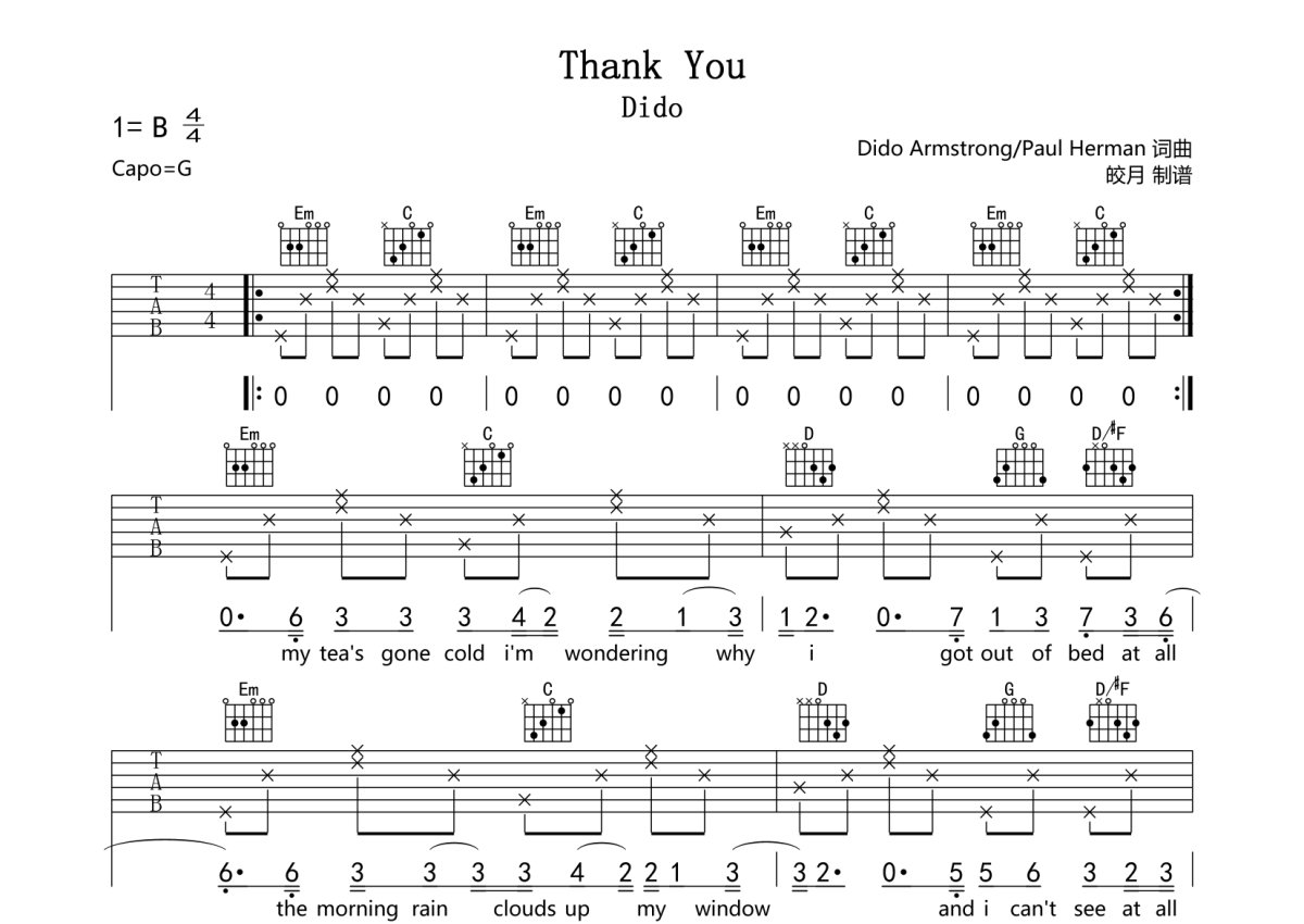《Thank You》是Dido (蒂朵)演唱的一首歌曲,本吉他谱采用的是G调指法编配,这份吉他谱共有三张高清图谱,图谱由 @珺妹儿 编配上传,图谱使用六线谱编配,包含吉他和弦指法、简谱以及歌词部分,使用这份Thank You吉他谱,可以让你更加方便地掌握这首歌曲的弹唱技巧,快来尝试吧。4/4拍的节奏,难度为低级。歌曲原调为B调,这里曲谱采用G调指法进行编配,演唱时夹变调夹4品可回到原调,也可根据个人嗓音情况选择,演奏速度建议保持75bmp,也可自由发挥。Dido单曲〈Thank You>,你一定觉得很熟悉,因为这首歌正是阿姆畅销单曲〈Stan>的独唱版。