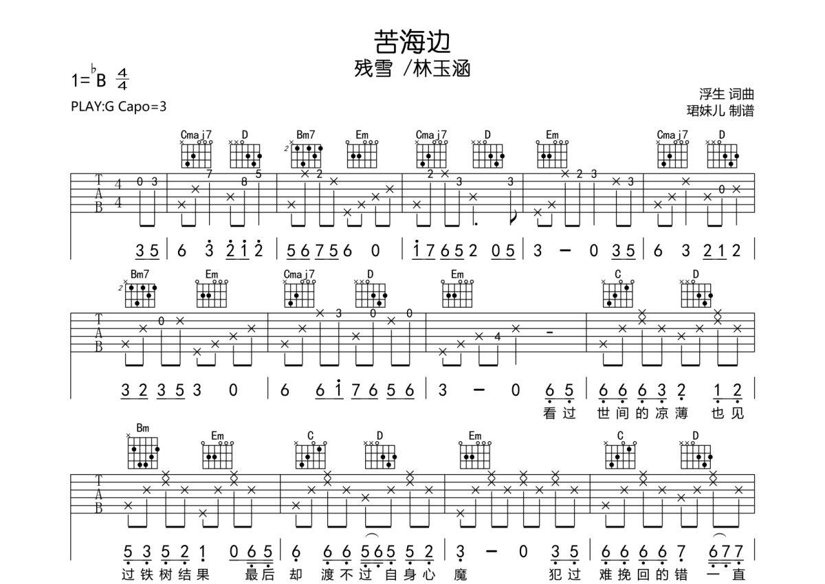 《苦海边》是雪 /林玉涵演唱的一首歌曲,本吉他谱采用的是G调指法编配,这份吉他谱共有三张高清图谱,图谱由 @珺妹儿 编配上传,图谱使用六线谱编配,包含吉他和弦指法、简谱以及歌词部分,使用这份苦海边吉他谱,可以让你更加方便地掌握这首歌曲的弹唱技巧,快来尝试吧。本谱采用G调指法编配,弹唱建议变调夹3品,速度85BPM,难度较简单,易上手。