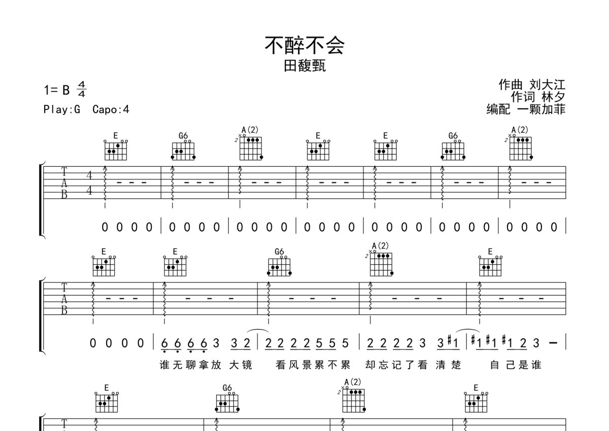 《不醉不会》是田馥甄演唱的一首歌曲,完整编配版,本吉他谱采用的是G调指法编配,这份吉他谱共有五张高清图谱,图谱由 @一颗加菲 编配上传,图谱使用六线谱编配,包含吉他和弦指法、简谱以及歌词部分,曲谱配备了相关的音频提供试听,使用这份不醉不会吉他谱,可以让你更加方便地掌握这首歌曲的弹唱技巧,快来尝试吧。