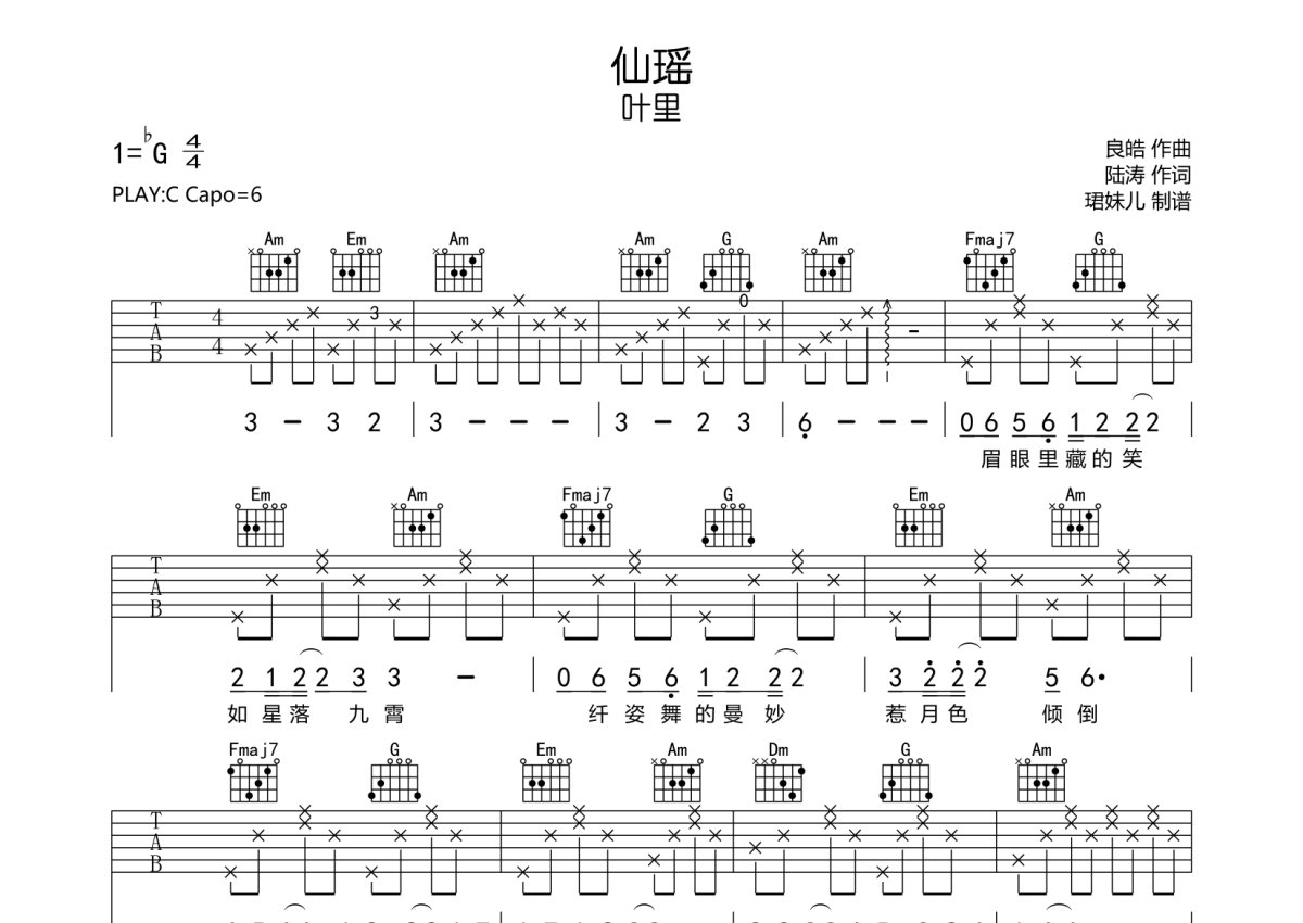 叶里《仙瑶》吉他谱 - C调弹唱六线谱