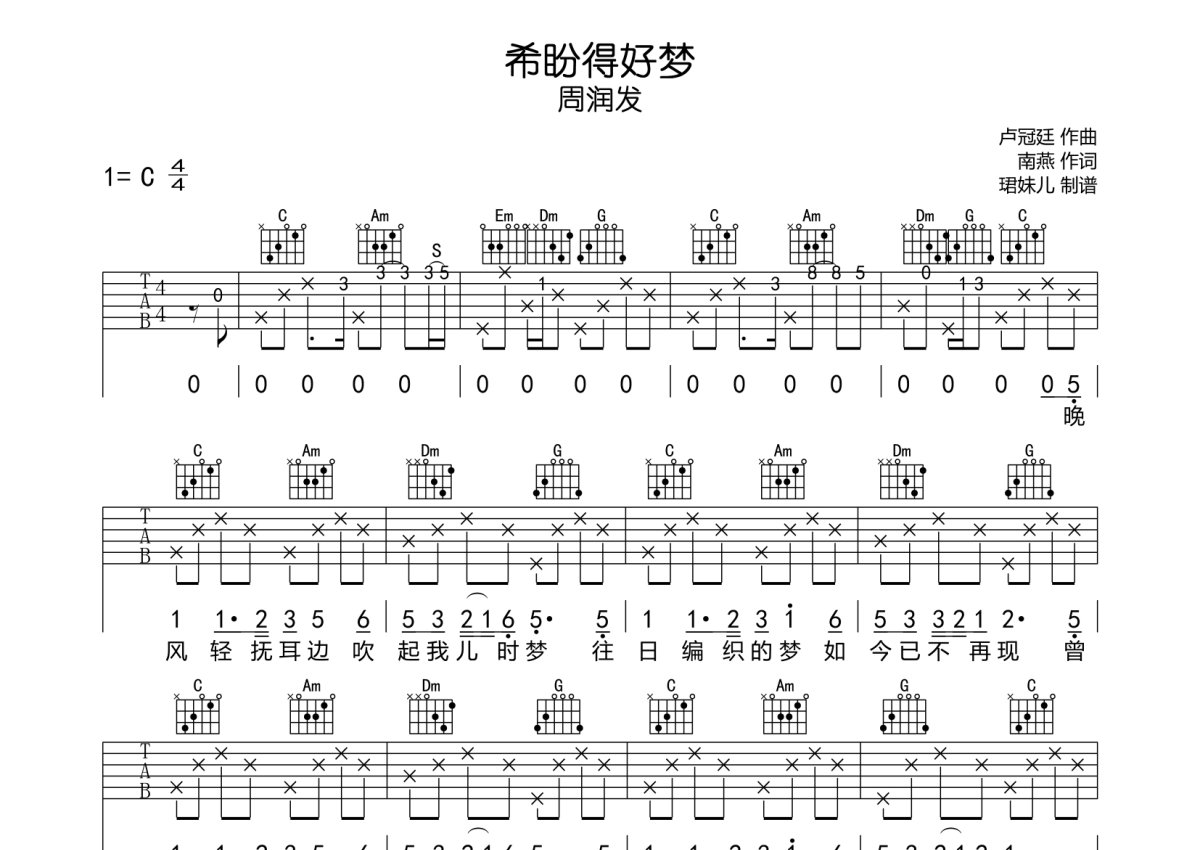 《希盼得好梦》是周润发演唱的一首歌曲,本吉他谱采用的是C调指法编配,这份吉他谱共有两张高清图谱,图谱由 @珺妹儿 编配上传,图谱使用六线谱编配,包含吉他和弦指法、简谱以及歌词部分,使用这份希盼得好梦吉他谱,可以让你更加方便地掌握这首歌曲的弹唱技巧,快来尝试吧。电影片尾曲,本谱采用C调指法编配,速度75BPM,难度较简单,易上手。