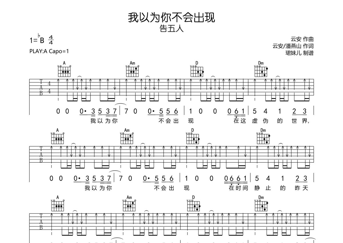 《我以为你不会出现》是告五人演唱的一首歌曲,本吉他谱采用的是A调指法编配,这份吉他谱共有四张高清图谱,图谱由 @珺妹儿 编配上传,图谱使用六线谱编配,包含吉他和弦指法、简谱以及歌词部分,使用这份我以为你不会出现吉他谱,可以让你更加方便地掌握这首歌曲的弹唱技巧,快来尝试吧。本谱采用A调指法编配,弹唱建议变调夹1品,速度85BPM,难度较简单,易上手。