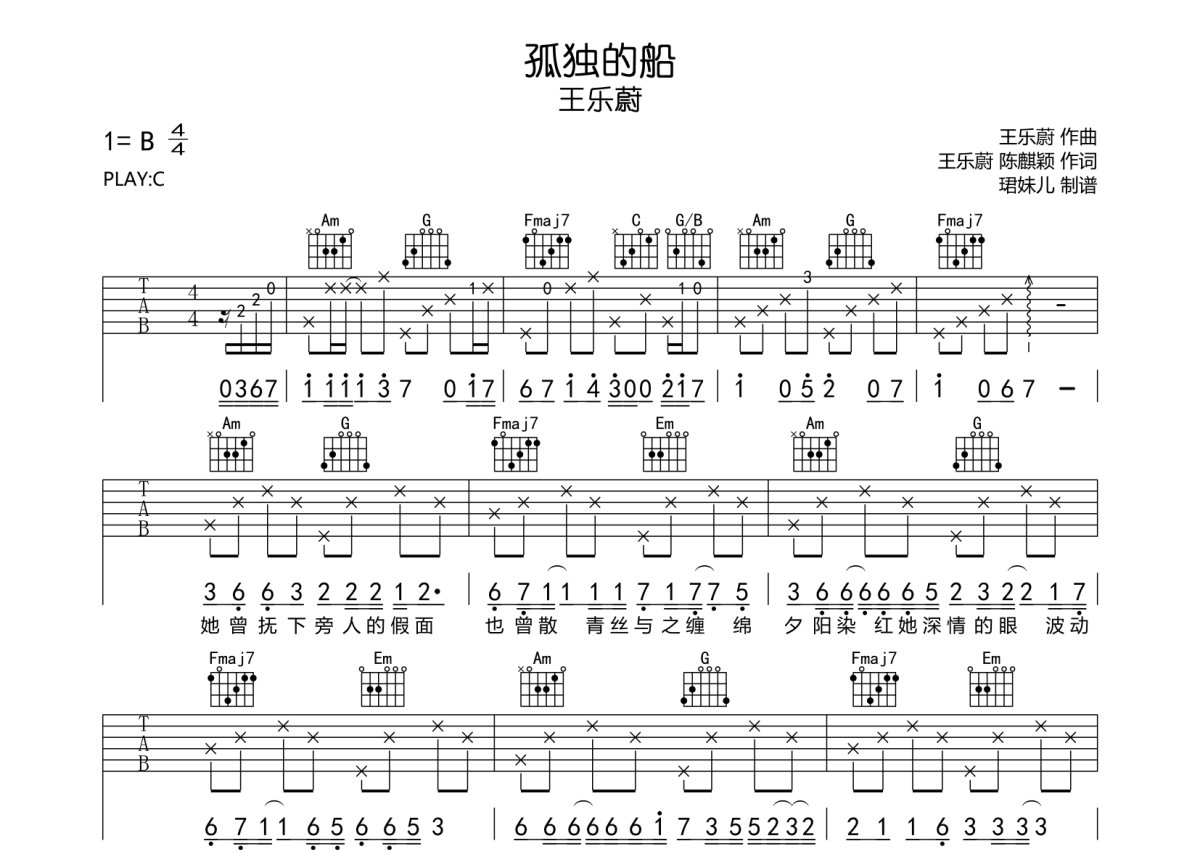 王乐蔚《孤独的船》吉他谱 - C调弹唱六线谱