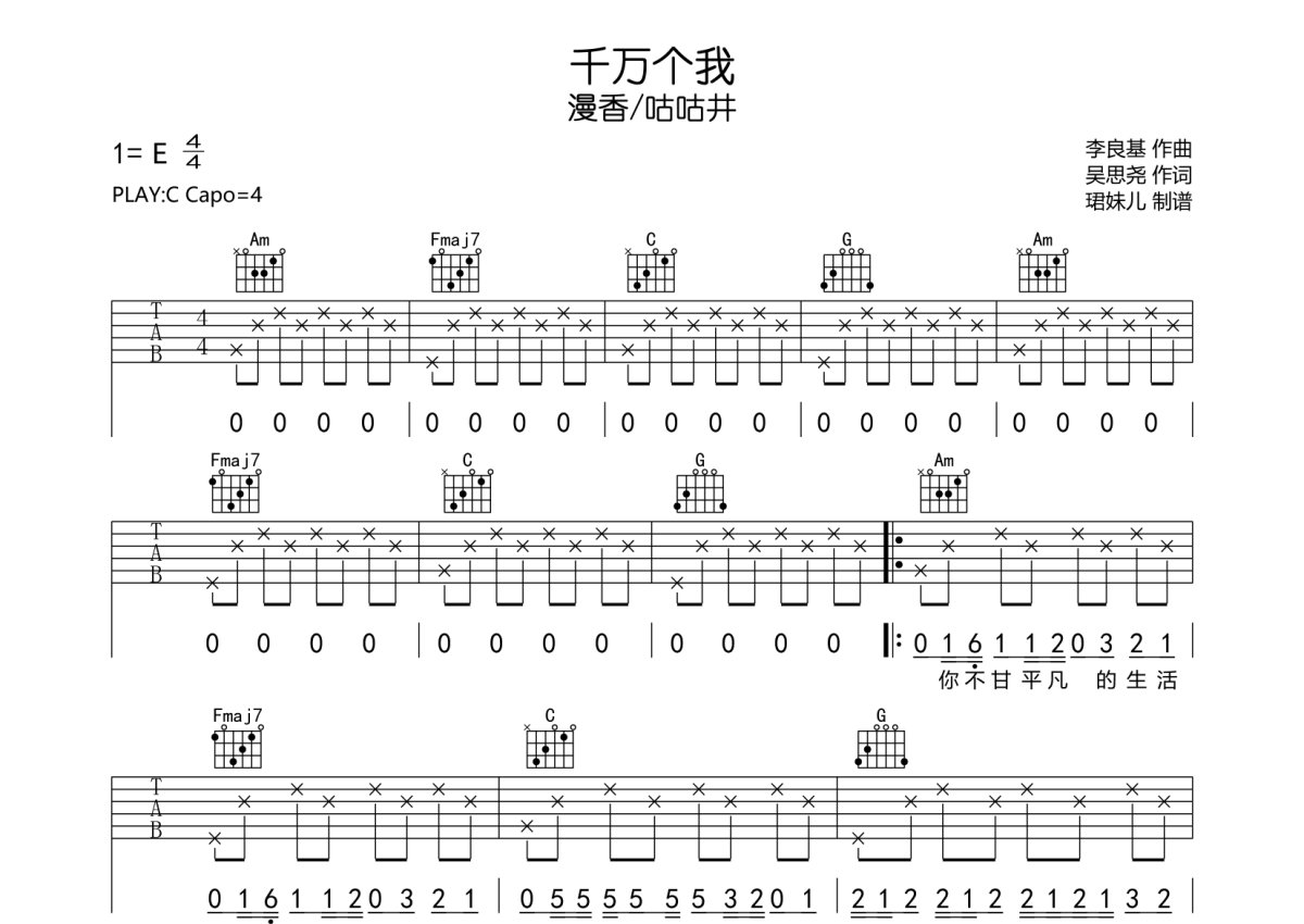 漫香/咕咕井《千万个我》吉他谱 - C调弹唱六线谱