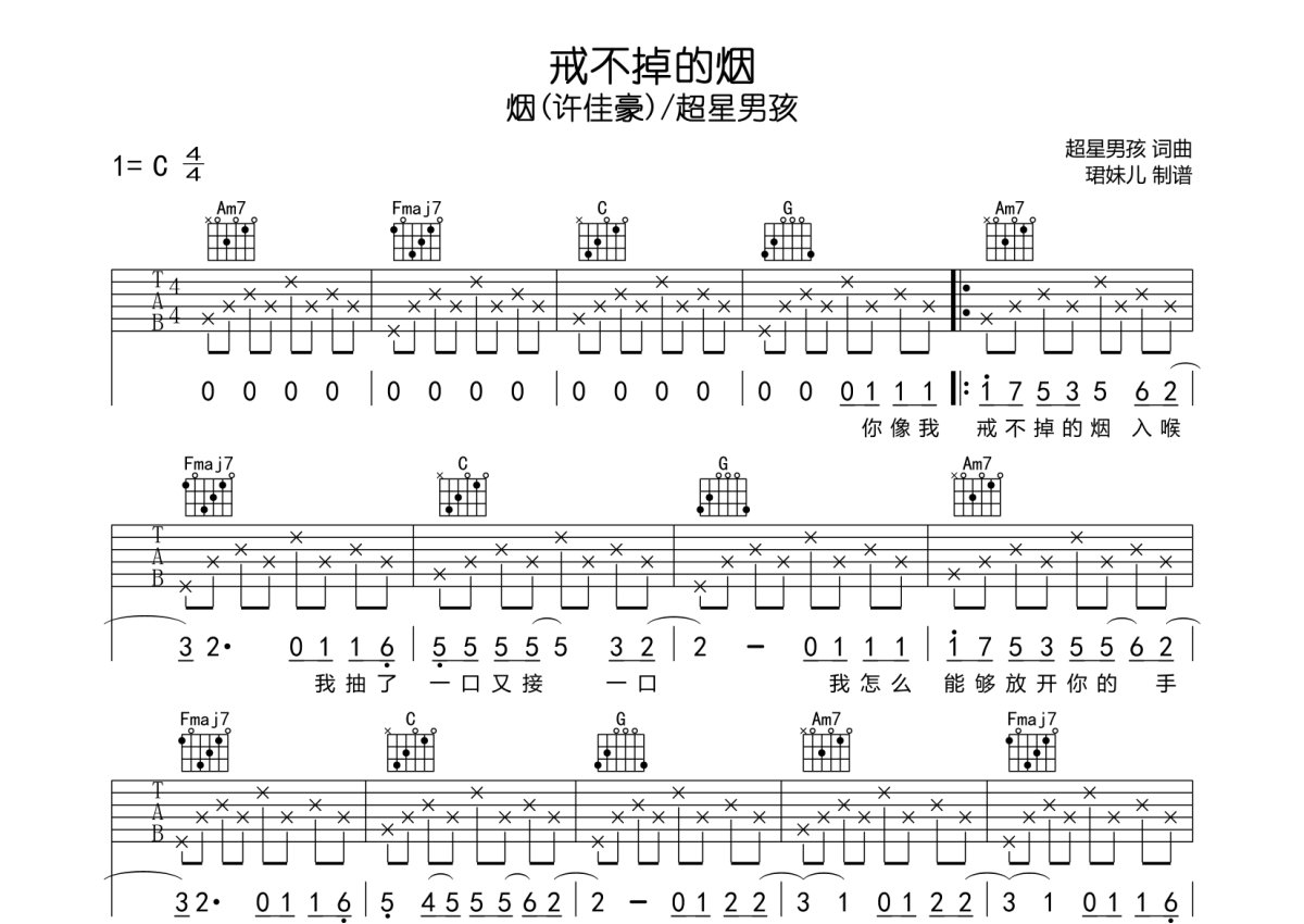 烟(许佳豪)/超星男孩《戒不掉的烟》吉他谱 - C调弹唱六线谱
