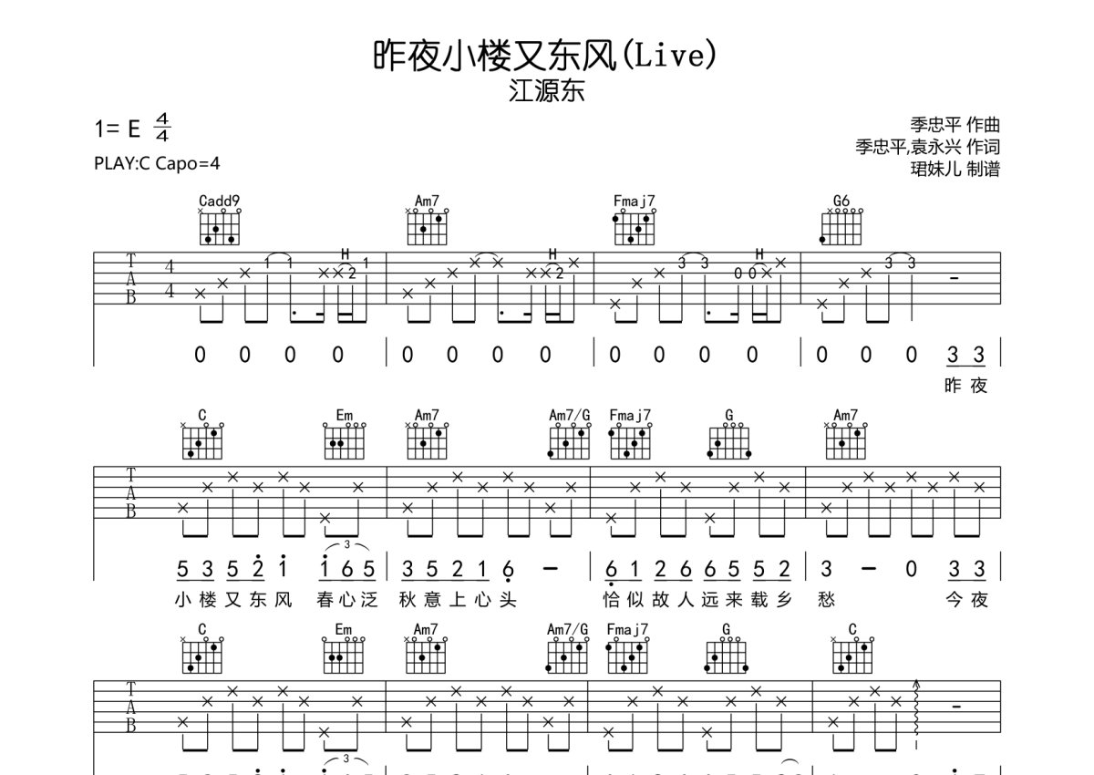 江源东《昨夜小楼又东风》吉他谱 - C调弹唱六线谱 - Live
