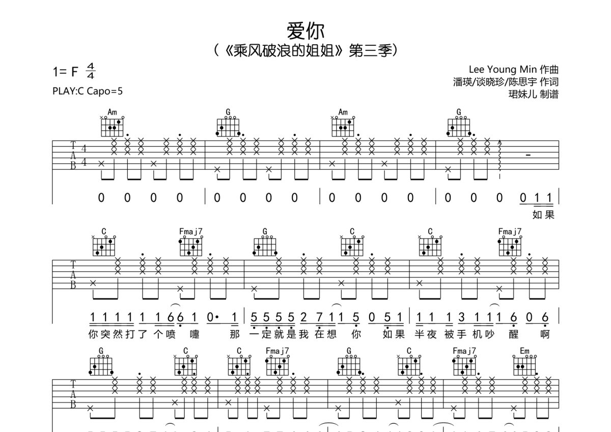 《爱你》是王心凌演唱的一首歌曲,本吉他谱采用的是C调指法编配,这份吉他谱共有两张高清图谱,图谱由 @珺妹儿 编配上传,图谱使用六线谱编配,包含吉他和弦指法、简谱以及歌词部分,使用这份爱你吉他谱,可以让你更加方便地掌握这首歌曲的弹唱技巧,快来尝试吧。《乘风破浪的姐姐》第三季 ,本谱采用C调指法编配,弹唱建议变调夹5品,速度85BPM,难度较简单,易上手。