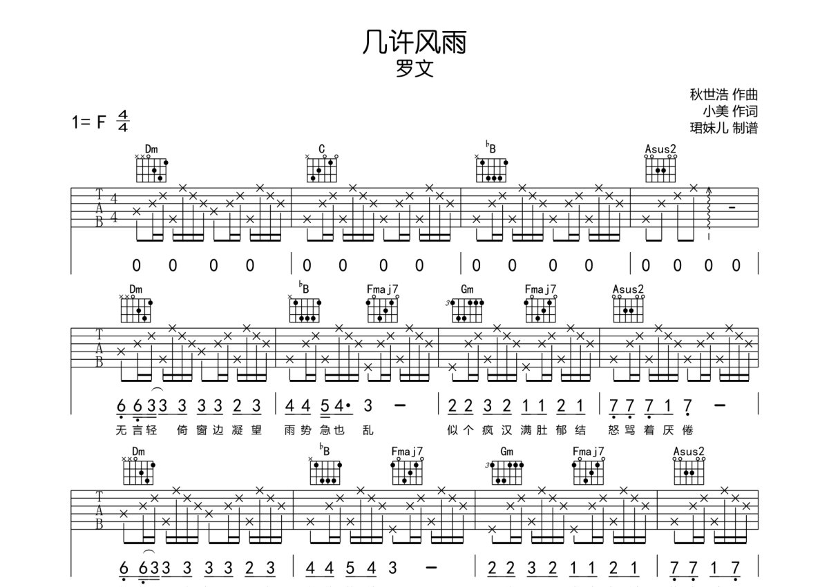 《几许风雨》是罗文演唱的一首歌曲,本吉他谱采用的是F调指法编配,这份吉他谱共有两张高清图谱,图谱由 @珺妹儿 编配上传,图谱使用六线谱编配,包含吉他和弦指法、简谱以及歌词部分,使用这份几许风雨吉他谱,可以让你更加方便地掌握这首歌曲的弹唱技巧,快来尝试吧。本谱采用F调指法编配,速度75BPM,难度较简单,易上手。