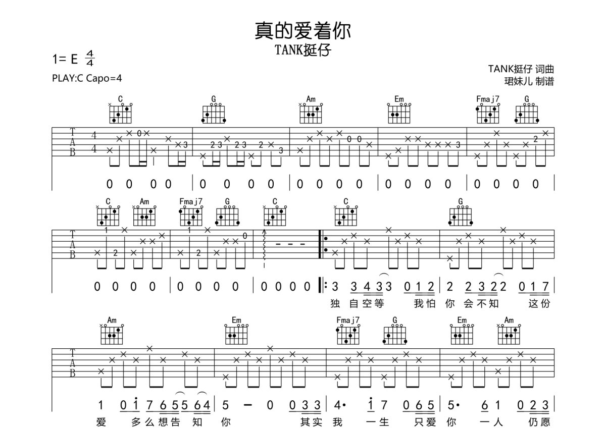 TANK挺仔《真的爱着你》吉他谱 - C调弹唱六线谱