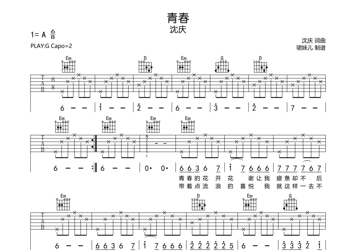 沈庆《青春》吉他谱 - G调弹唱六线谱