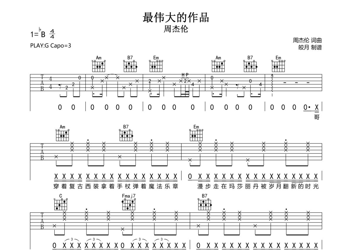 《最伟大的作品》是周杰伦演唱的一首歌曲,本吉他谱采用的是G调指法编配,这份吉他谱共有四张高清图谱,图谱由 @珺妹儿 编配上传,图谱使用六线谱编配,包含吉他和弦指法、简谱以及歌词部分,使用这份最伟大的作品吉他谱,可以让你更加方便地掌握这首歌曲的弹唱技巧,快来尝试吧。本谱采用G调指法编配,弹唱建议变调夹3品,速度85BPM,难度较简单,易上手。