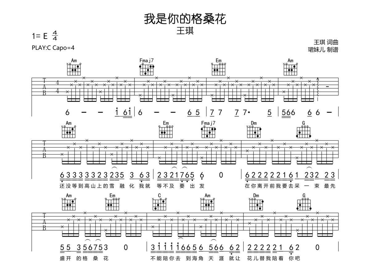 《我是你的格桑花》是王琪演唱的一首歌曲,本吉他谱采用的是C调指法编配,这份吉他谱共有两张高清图谱,图谱由 @珺妹儿 编配上传,图谱使用六线谱编配,包含吉他和弦指法、简谱以及歌词部分,使用这份我是你的格桑花吉他谱,可以让你更加方便地掌握这首歌曲的弹唱技巧,快来尝试吧。本谱采用C调指法编配,弹唱建议变调夹4品,速度85BPM,难度较简单,易上手。