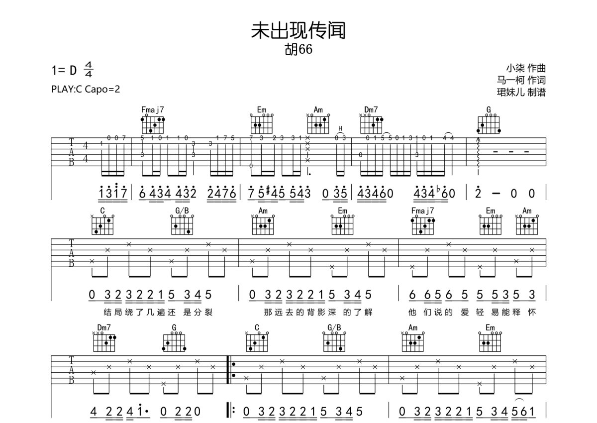 胡66《未出现传闻》吉他谱 - C调弹唱六线谱