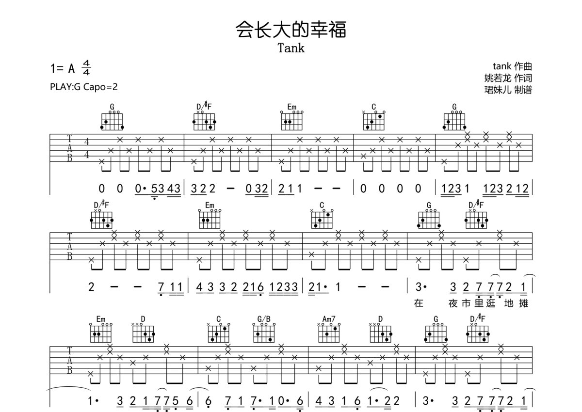 《会长大的幸福》是Tank演唱的一首歌曲,本吉他谱采用的是G调指法编配,这份吉他谱共有三张高清图谱,图谱由 @珺妹儿 编配上传,图谱使用六线谱编配,包含吉他和弦指法、简谱以及歌词部分,使用这份会长大的幸福吉他谱,可以让你更加方便地掌握这首歌曲的弹唱技巧,快来尝试吧。本谱采用G调指法编配,弹唱建议变调夹2品,速度85BPM,难度较简单,易上手.。