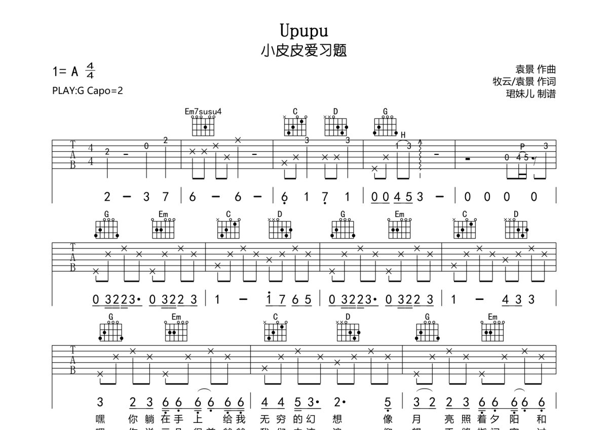 小皮皮爱习题《Upupu》吉他谱 - G调弹唱六线谱