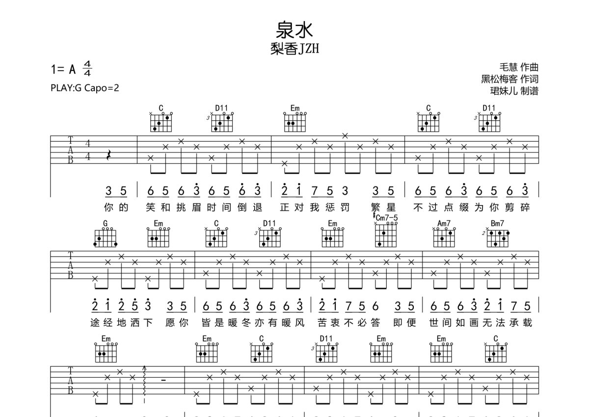 《泉水》是梨香JZH演唱的一首歌曲,本吉他谱采用的是G调指法编配,这份吉他谱共有三张高清图谱,图谱由 @珺妹儿 编配上传,图谱使用六线谱编配,包含吉他和弦指法、简谱以及歌词部分,使用这份泉水吉他谱,可以让你更加方便地掌握这首歌曲的弹唱技巧,快来尝试吧。本谱采用G调指法编配,弹唱建议变调夹2品,速度85BPM,难度较简单,易上手。