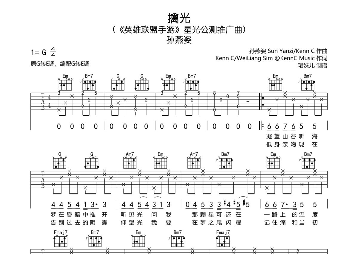 孙燕姿《擒光》吉他谱 - G调弹唱六线谱