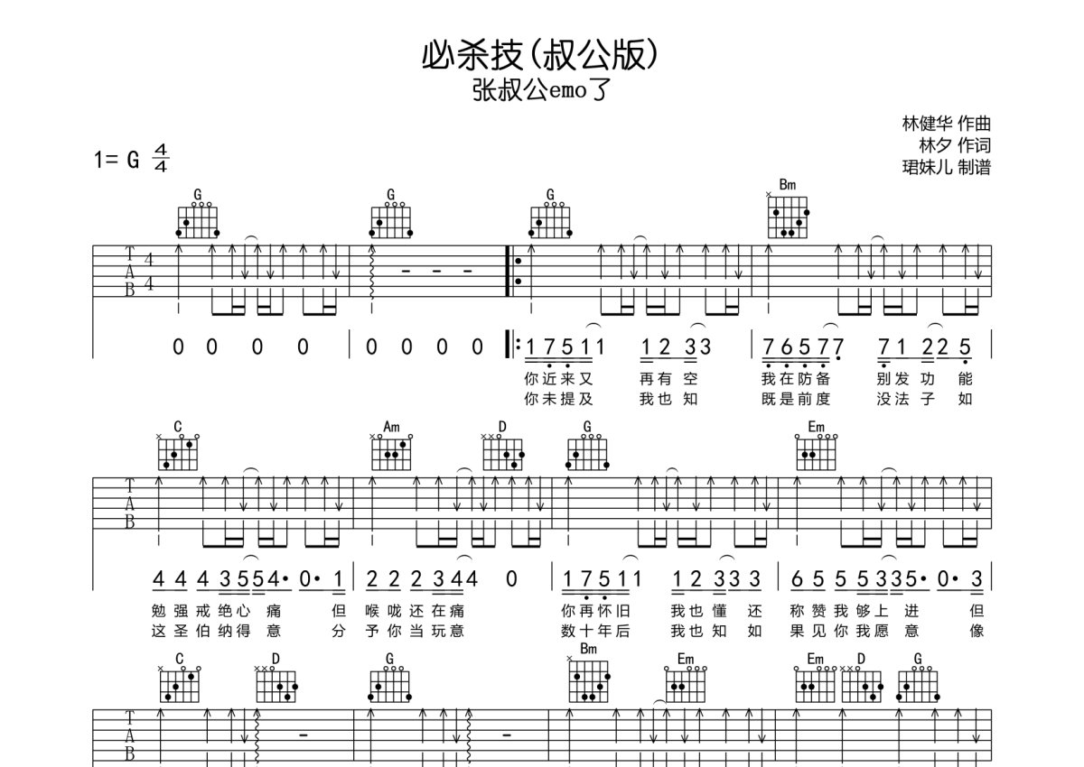 张叔公emo 了《必杀技(叔公版)》吉他谱 - G调弹唱六线谱