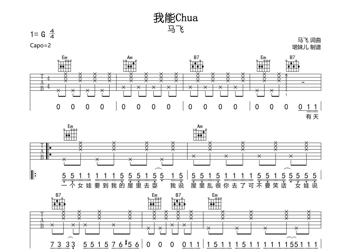 马飞《我能Chua》吉他谱 - G调弹唱六线谱