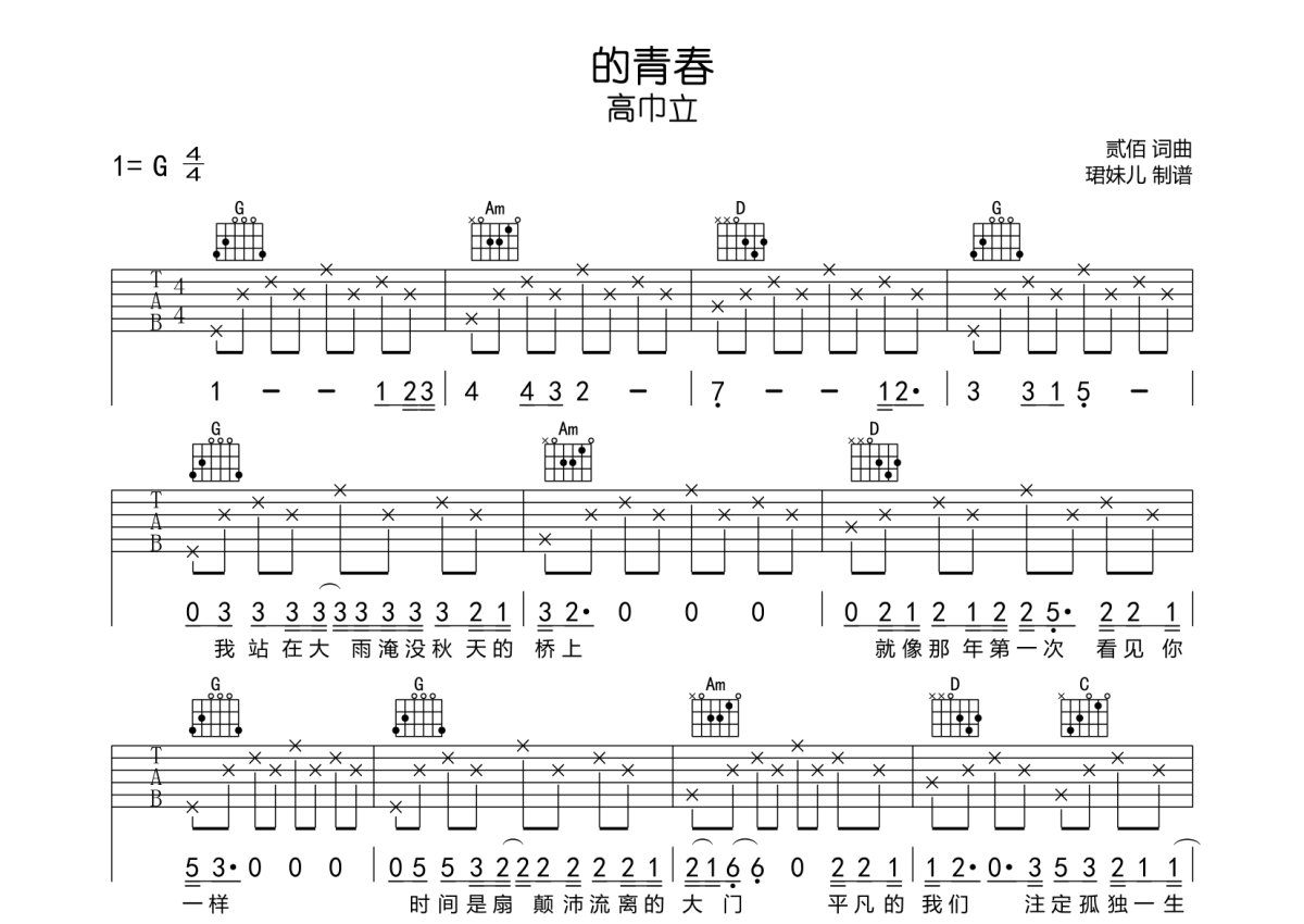 高巾立《的青春》吉他谱 - G调弹唱六线谱