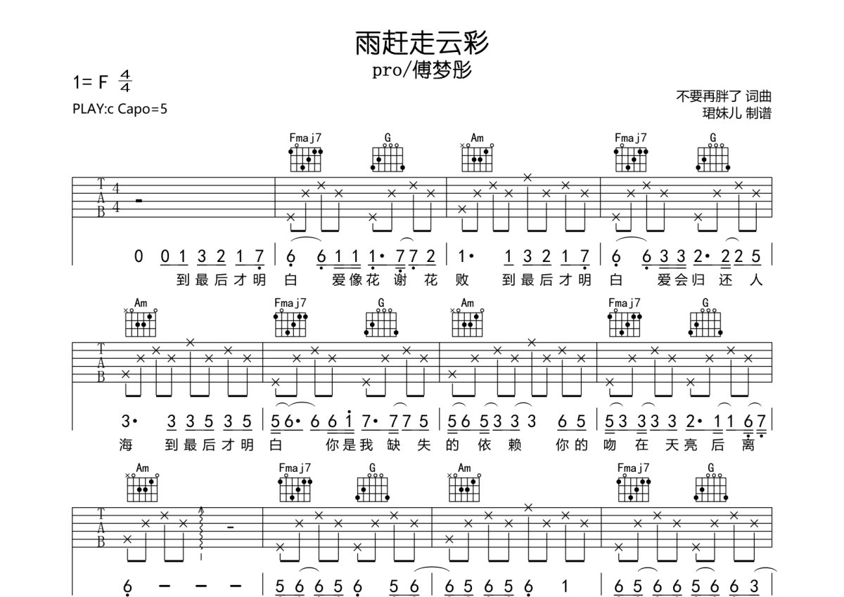 pro/傅梦彤《雨赶走云彩》吉他谱 - C调弹唱六线谱