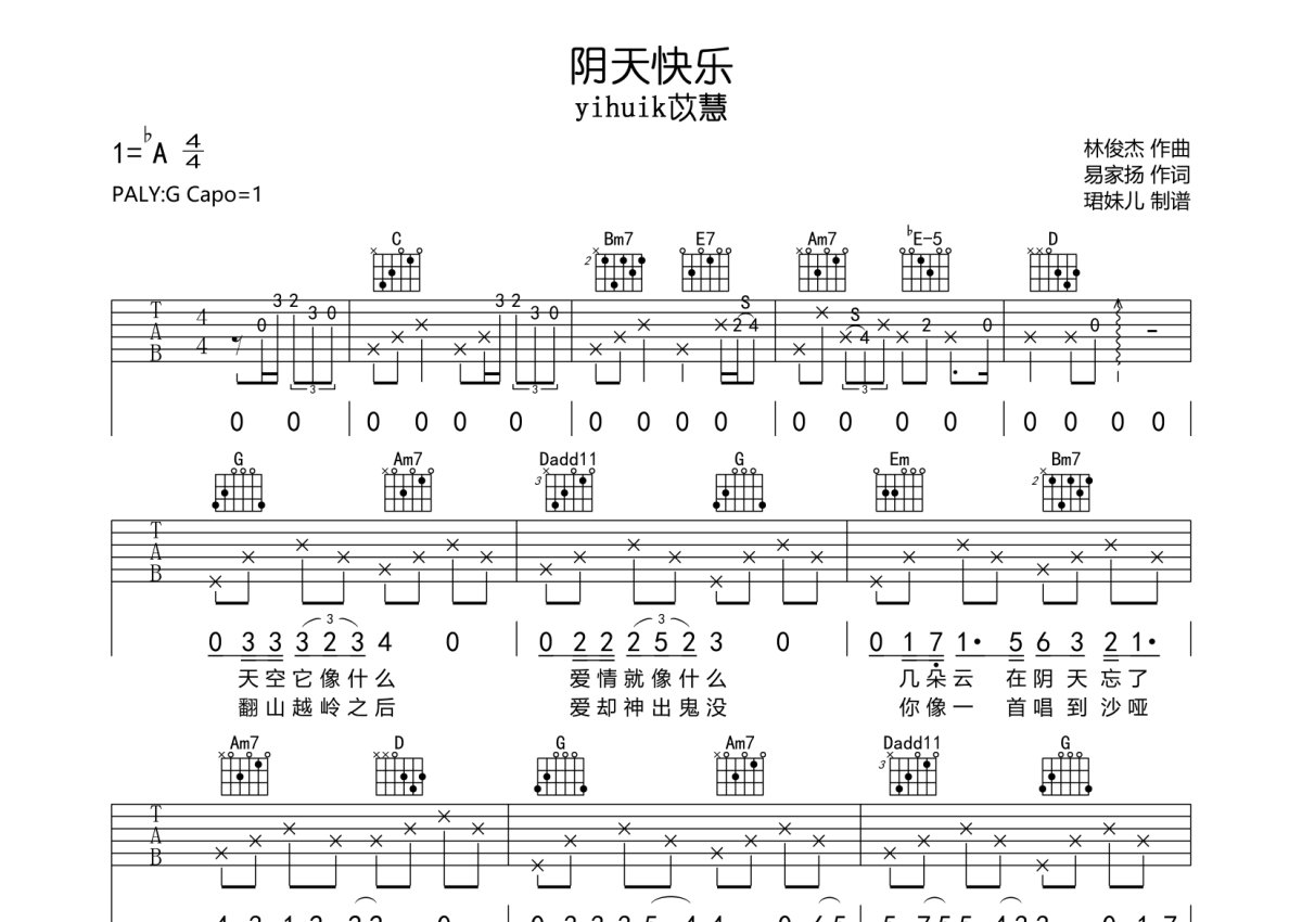 yihuik苡慧《阴天快乐》吉他谱 - G调弹唱六线谱