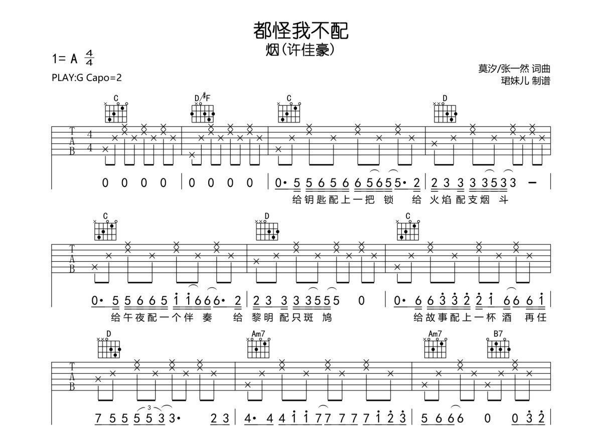 烟(许佳豪)《都怪我不配》吉他谱 - G调弹唱六线谱