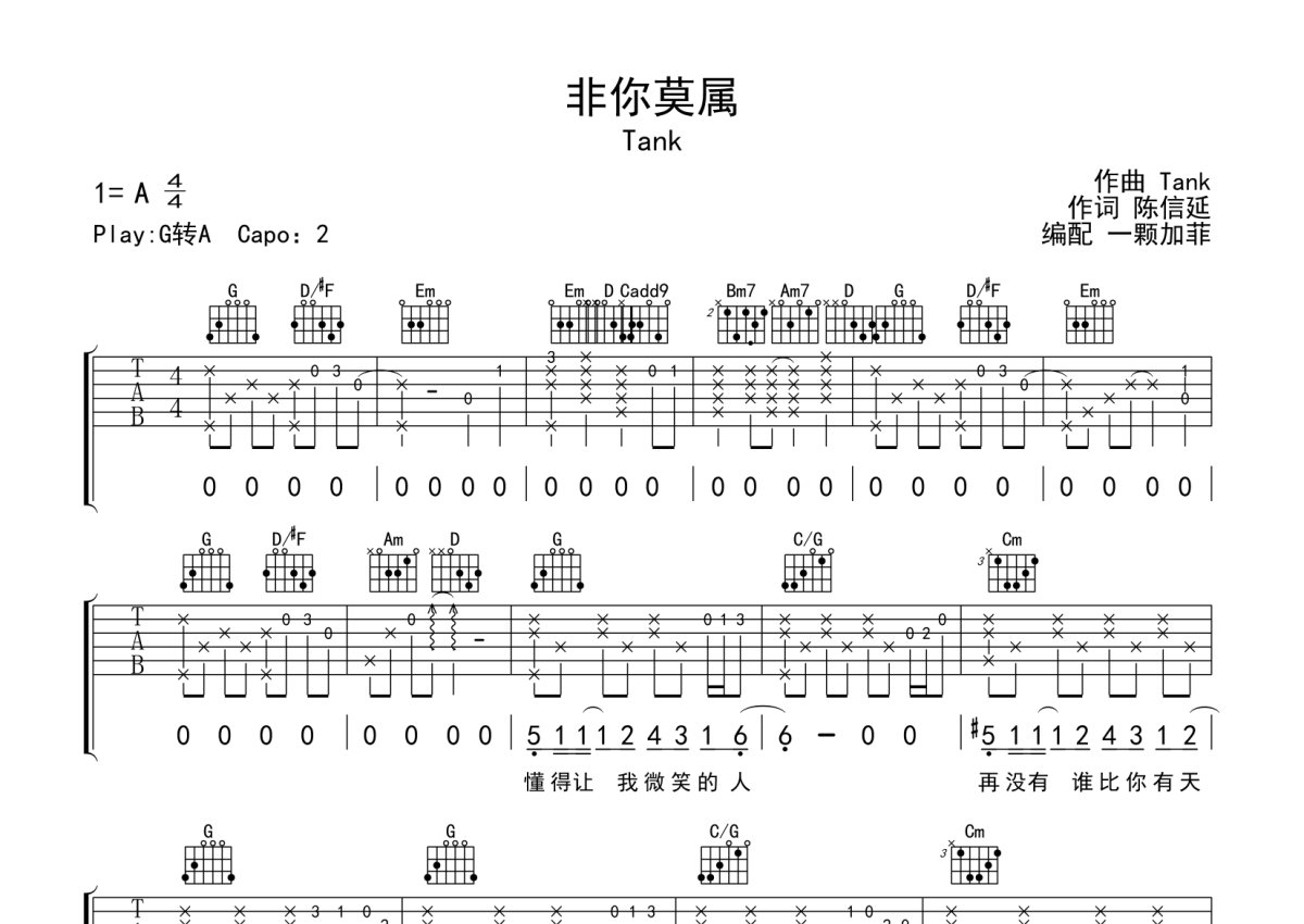 Tank《非你莫属》吉他谱 - G调弹唱六线谱 - 完整编配版