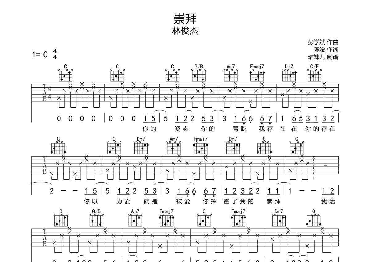 林俊杰《崇拜》吉他谱 - C调弹唱六线谱