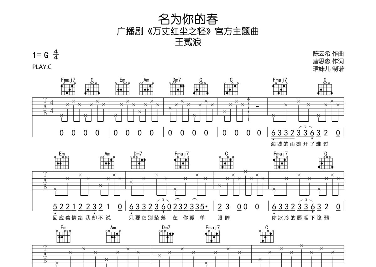 王贰浪《名为你的春》吉他谱 - C调弹唱六线谱