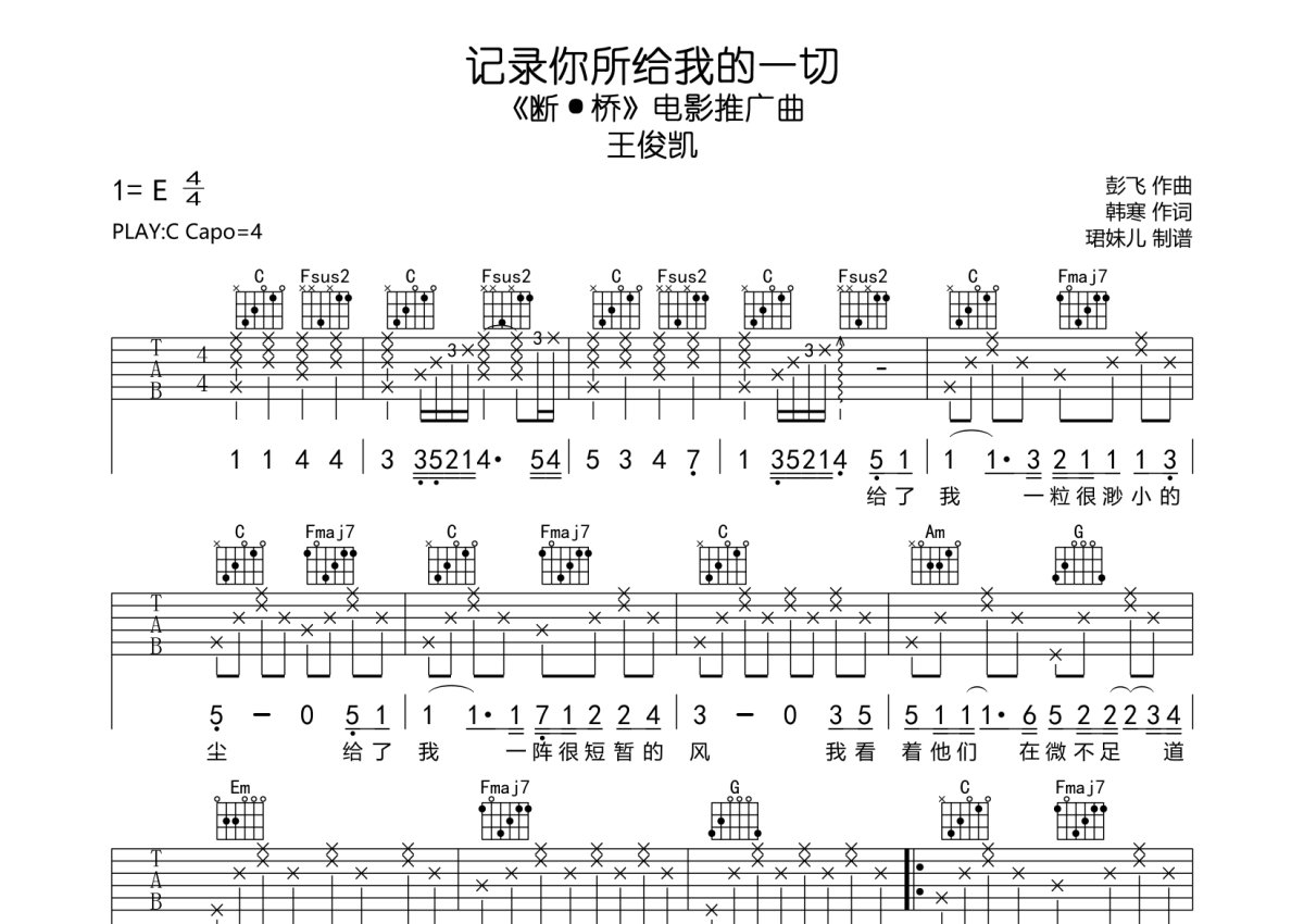 《记录你所给我的一切》是王俊凯演唱的一首歌曲,本吉他谱采用的是C调指法编配,这份吉他谱共有两张高清图谱,图谱由 @珺妹儿 编配上传,图谱使用六线谱编配,包含吉他和弦指法、简谱以及歌词部分,使用这份记录你所给我的一切吉他谱,可以让你更加方便地掌握这首歌曲的弹唱技巧,快来尝试吧。《断·桥》电影推广曲,本谱采用C调指法编配,弹唱建议变调夹4品,速度85BPM难度较简单,易上手。