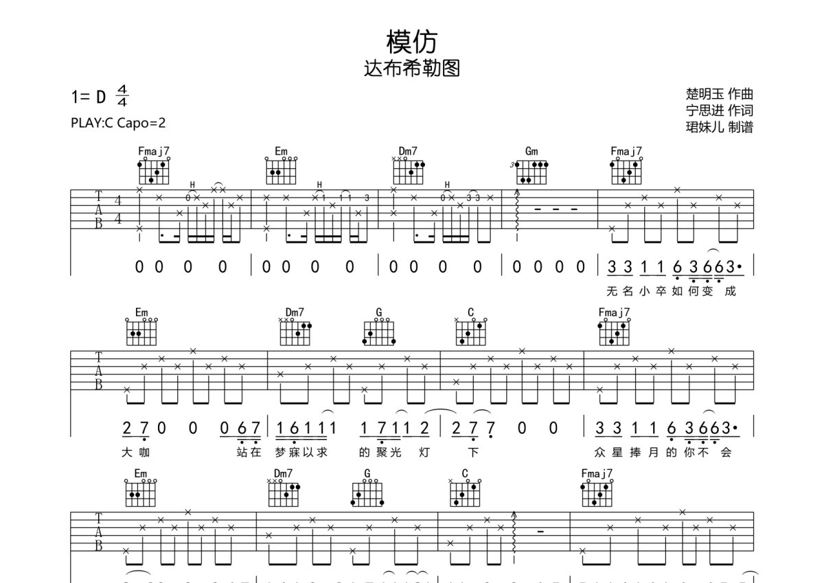 《模仿》是达布希勒图演唱的一首歌曲,本吉他谱采用的是C调指法编配,这份吉他谱共有三张高清图谱,图谱由 @珺妹儿 编配上传,图谱使用六线谱编配,包含吉他和弦指法、简谱以及歌词部分,使用这份模仿吉他谱,可以让你更加方便地掌握这首歌曲的弹唱技巧,快来尝试吧。本谱采用C调指法编配,弹唱建议变调夹2品,速度85BPM难度较简单,易上手。