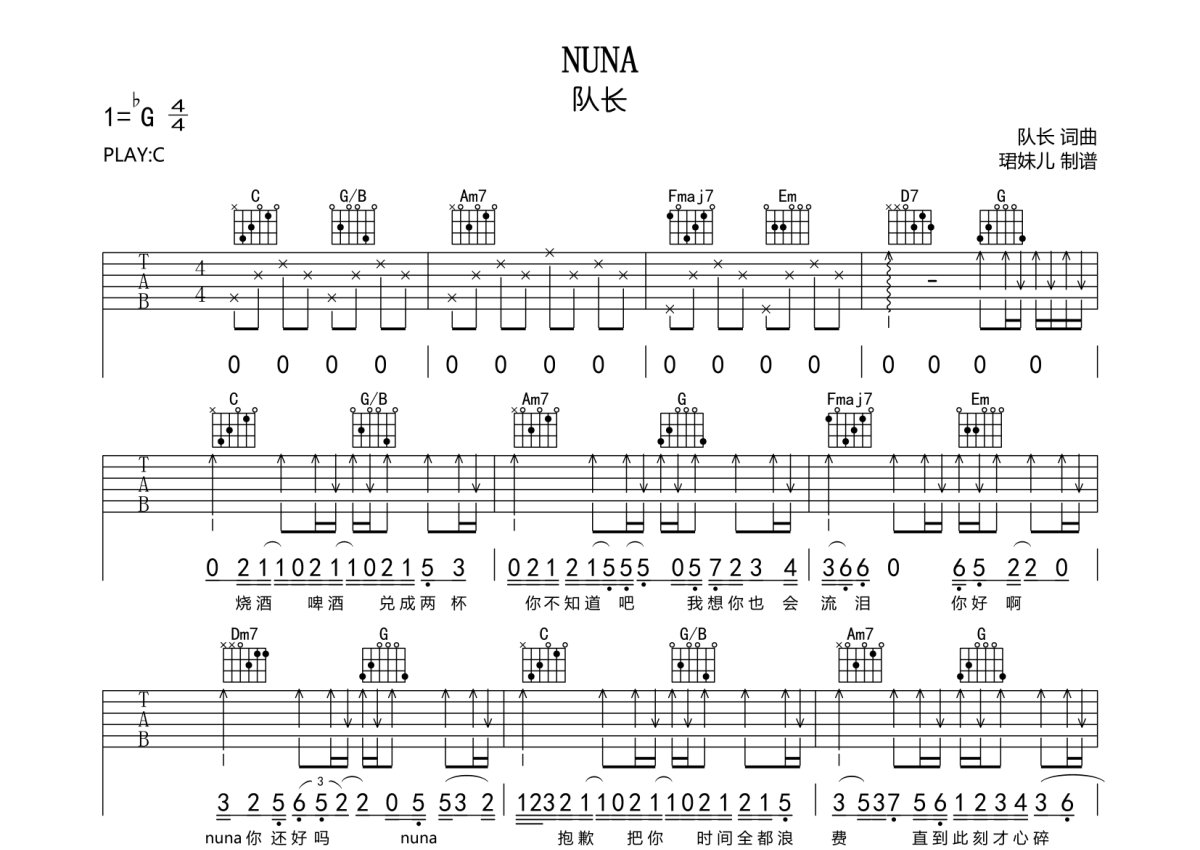 队长《NUNA》吉他谱 - C调弹唱六线谱